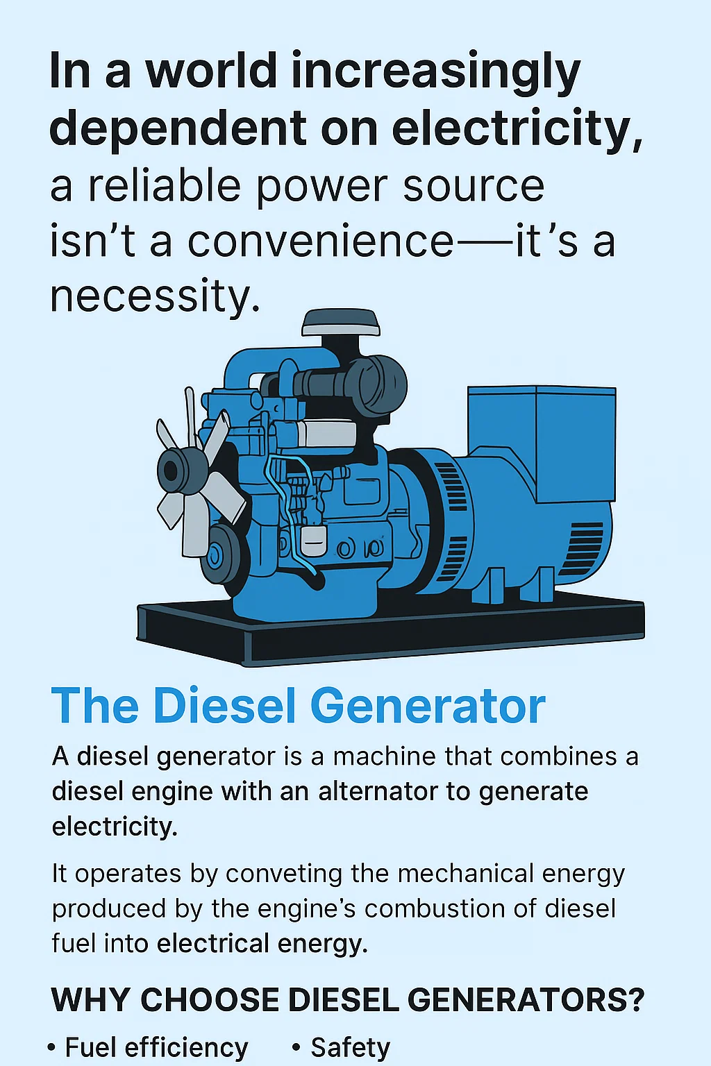 A diesel generator , eller strømgenerator , er en maskine, der kombinerer en diesel motor med en generator at generere elektricitet . Den fungerer ved at omdanne den mekaniske energi, der produceres ved motorens forbrænding af diesel brændstof til elektrisk energi. Disse kraftfulde maskiner er kendt for deres holdbarhed, brændstofeffektivitet og lange levetid, hvilket gør dem til et foretrukket valg til en bred vifte af applikationer, fra backup i boliger til at drive hele byer.